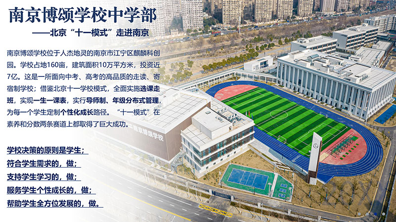 南京博頌學(xué)校位于人杰地靈的南京市江寧區(qū)麒麟科創(chuàng)園。學(xué)校占地160畝,建筑面積10萬平方米,投資近7億。 南京博頌學(xué)校普高部是一所面向國內(nèi)高考的高品質(zhì)的寄宿制學(xué)校。學(xué)校匯聚了一批特級教師,正高級教師,省市級名師,知識競賽教練以及畢業(yè)于北大,南大,華中師大,南師大等名校的精英教師。