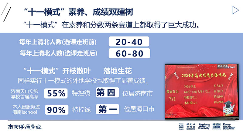 “十一模式”在素養(yǎng)和分?jǐn)?shù)兩條賽道上都取得了巨大成功。選課走班前,北京十一學(xué)校每年上清北人數(shù)20一40人;選課走班后清北人數(shù)是60一80人。同樣實(shí)行十一模式的外地學(xué)校也取得了顯著成績,例如,濟(jì)南天山實(shí)驗(yàn)學(xué)校,首屆高考上特控線比例達(dá)到55%。魏勇校長曾經(jīng)服務(wù)過的海南微城未來學(xué)校ISCHOOL首屆高考上特控線比例達(dá)到90%。